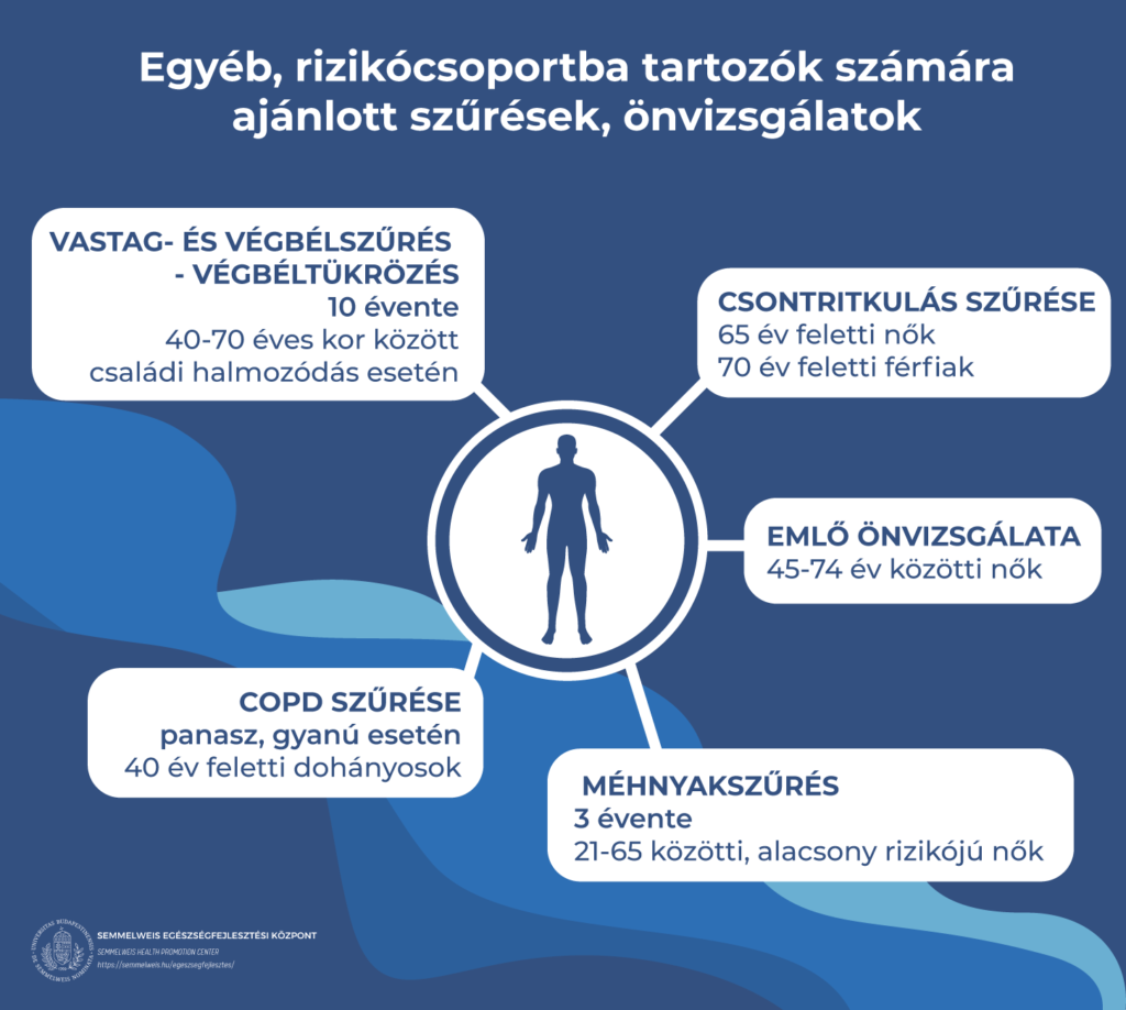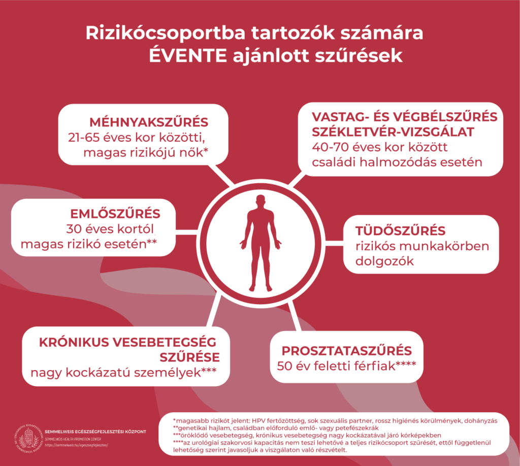 Vannak olyan betegségek, amelyek felderítésére nincs hatékony szűrőeszköz, tehát rendkívül fontos saját szerepvállalásunk, a panaszaink korai felismerése, valamint a szükséges első lépések megtétele. Nagyobbrészt saját magunkon múlnak az életkilátásaink, ezért ne halogassuk a szűréseken, vizsgálatokon való részvételt.