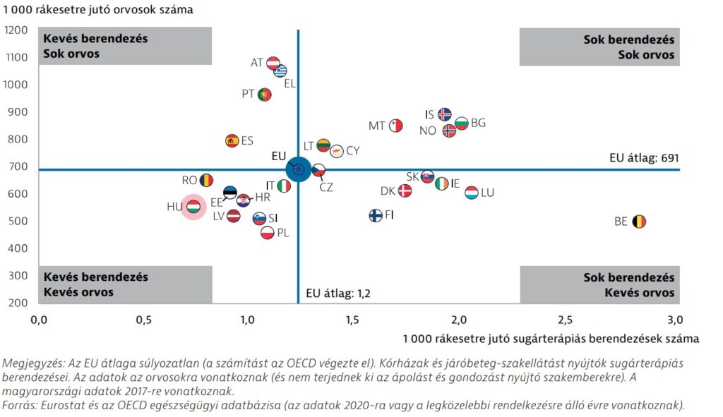 Bár a szűrővizsgálatok és az ellátás terén is tett lépéseket Magyarország az elmúlt években, regionális és nemzeti szinten továbbra is hiány van a rákellátásban dolgozó szakemberekből, és a sugárterápiás eszközök sűrűsége alacsony, mutat rá az OECD. Jelenleg csak az Országos Onkológiai Intézet rendelkezik elegendő számú, a szükséges képesítéssel rendelkező onkológussal, sugárterapeutával, radiológussal és rezidenssel.